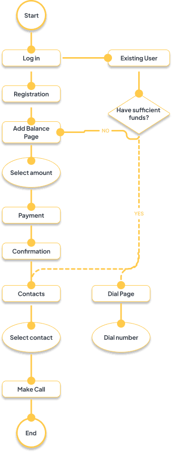 I translated ideas into low and mid-fidelity wireframes to define structure, user flow, and key interactions. The focus was on simplifying navigation so users could add funds, search contacts, and make calls in fewer steps.