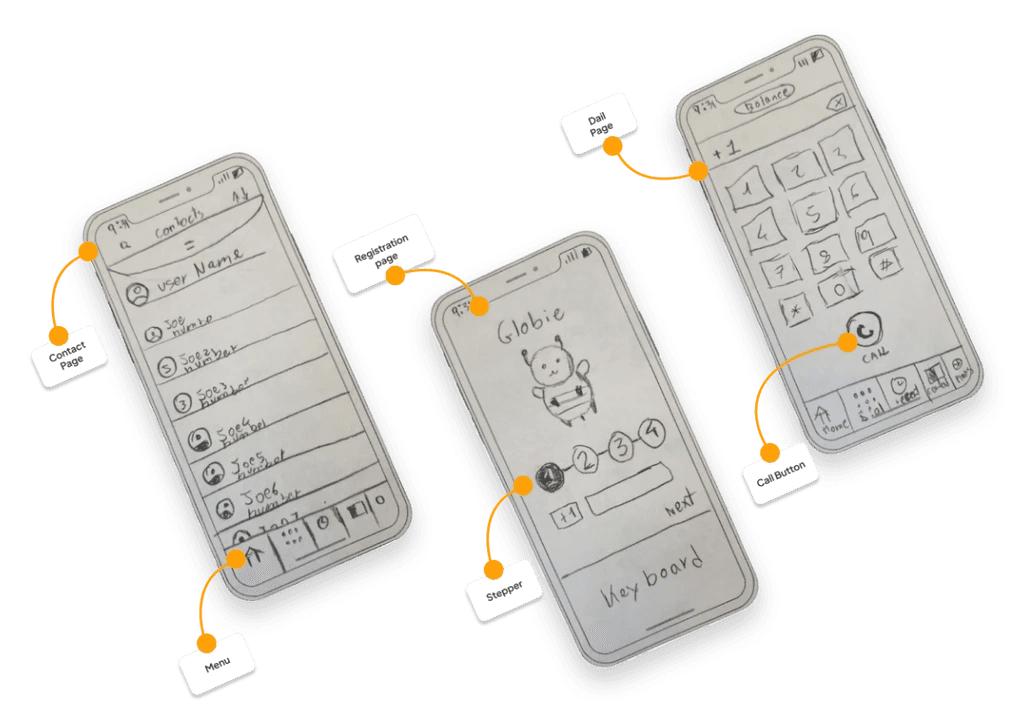 The interface was cluttered with unclear navigation. Users struggled to find key actions like adding funds or making calls. There was no onboarding to guide new users. The calling flow had too many steps, causing drop-offs. The visual design felt outdated and didn't reflect the friendly, approachable brand Globie wanted to be.