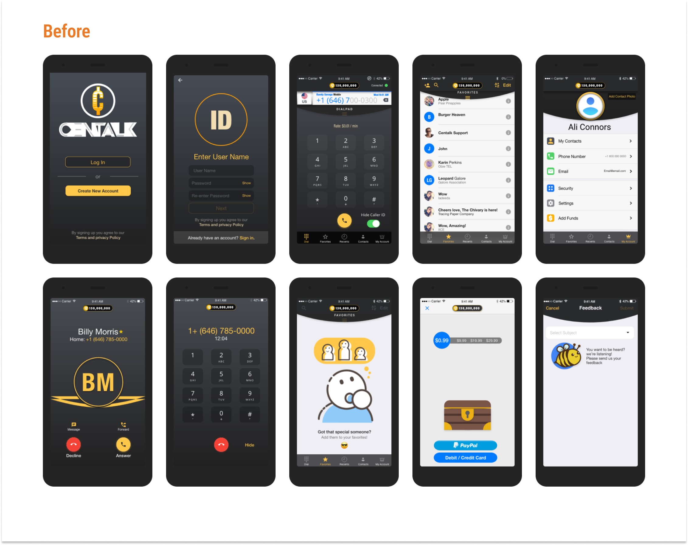 An outdated mobile UI with cluttered screens, unclear navigation, and no guided onboarding. Users struggled to find key actions like adding funds or making a call, leading to drop-offs and incomplete calls.