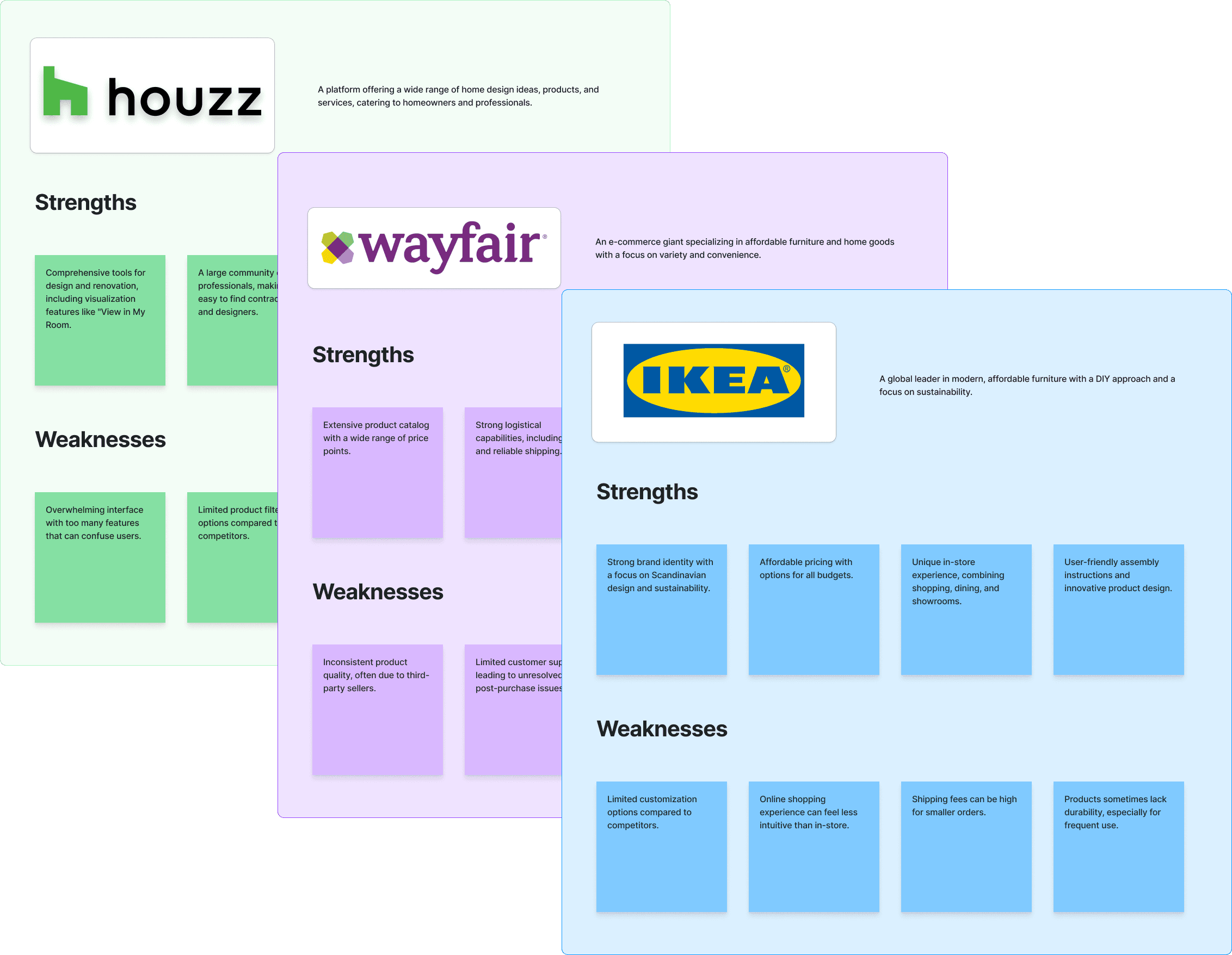 I started by analyzing competitors to understand what worked in the furniture and home décor e-commerce space. I looked at Houzz, Wayfair, and IKEA to see how they structured their sites, displayed products, and handled checkout.