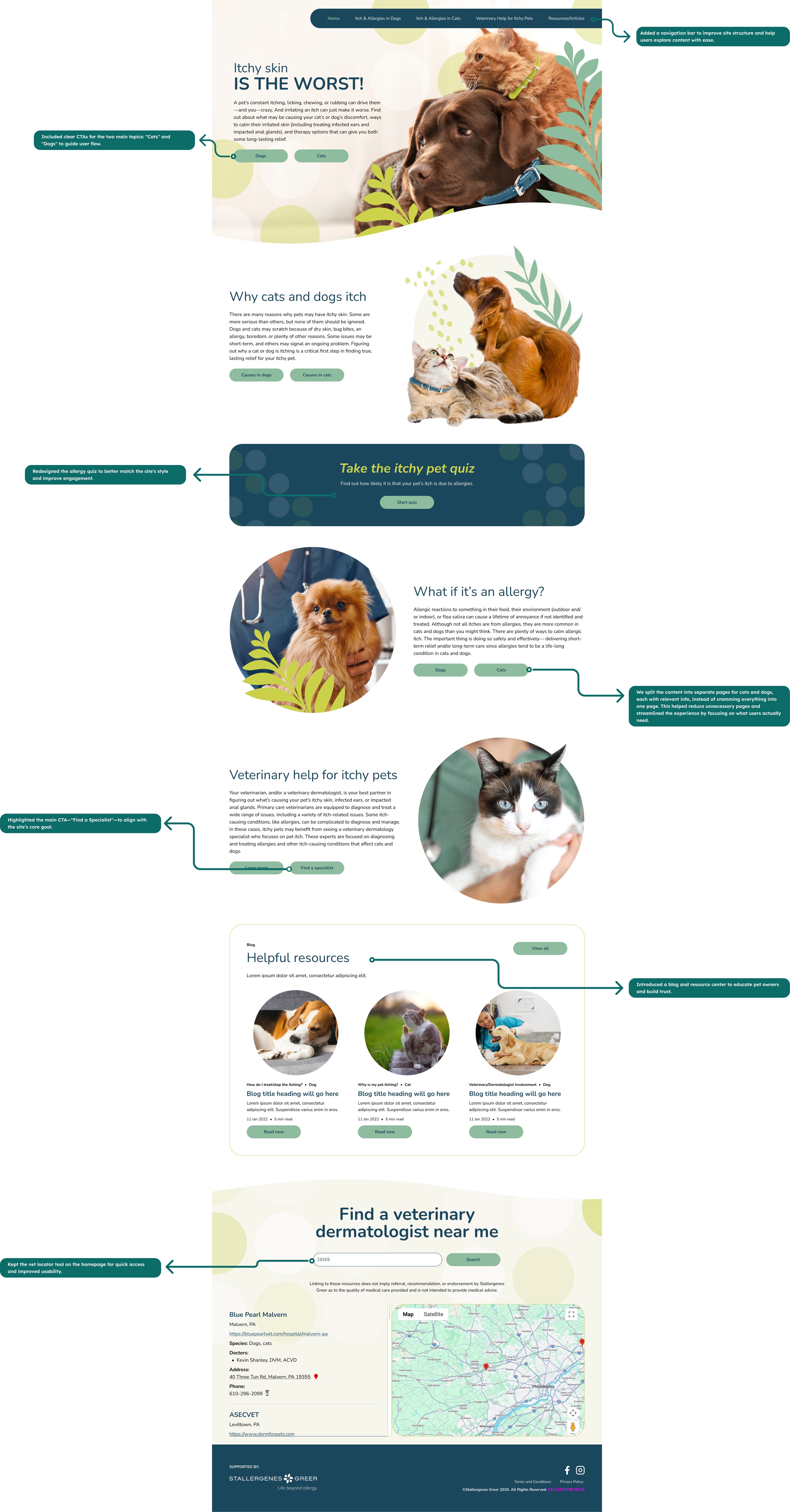 Sitemap & IA: Built a clean, multi-page structure with separate paths for dogs and cats, allergy basics, testing, ASIT info, and a “Find a Vet” tool.
